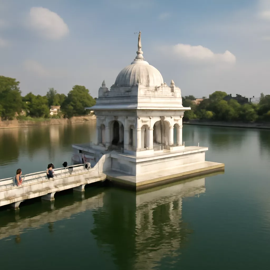 Jal Mandir, located in Mathura, India is a stunning temple dedicated to Lord Krishna. Situated in the middle of the picturesque Kusum Sarovar Lake, the temple is known for its unique architecture and serene surroundings. Visitors can access the temple by a narrow causeway that leads them through the tranquil waters of the lake. The temple is adorned with beautiful carvings and intricate designs, making it a popular pilgrimage site for devotees. The peaceful ambiance of Jal Mandir, combined with its spiritual significance, makes it a must-visit destination for those seeking solace and tranquility.