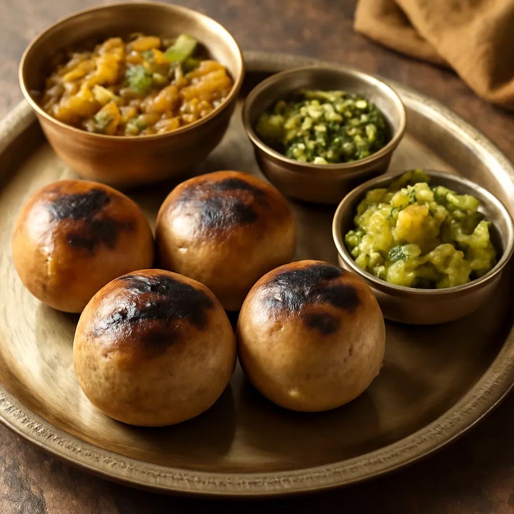A traditional baked wheat ball stuffed with sattu (roasted gram flour) and spices, served with chokha (mashed vegetables).