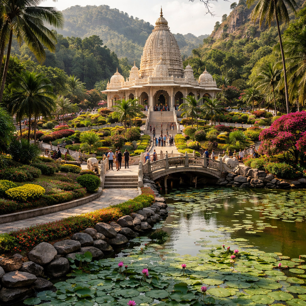 Among the notable features of Govind Vatika are the intricately carved stone panels that adorn the temple walls, depicting various scenes from the life of Lord Krishna. One particularly striking panel illustrates the "Raasa Leela," a dance between Krishna and the gopis (milkmaids), showcasing the artist's skill in capturing movement and emotion. The central sanctum, or "Garbha Griha," houses a beautifully sculpted idol of Lord Krishna, crafted from black basalt and adorned with traditional jewelry made from hand-beaten brass. Visitors are also encouraged to explore the surrounding gardens, which are meticulously landscaped with native flora, providing a serene backdrop for contemplation and prayer. The elevated viewpoint at the rear of the complex offers panoramic views of the surrounding landscape, enhancing the spiritual experience.