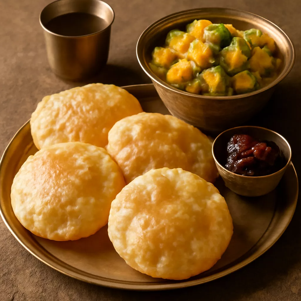 Fluffy deep-fried bread served with a spiced potato curry, a staple breakfast in Midnapore.
